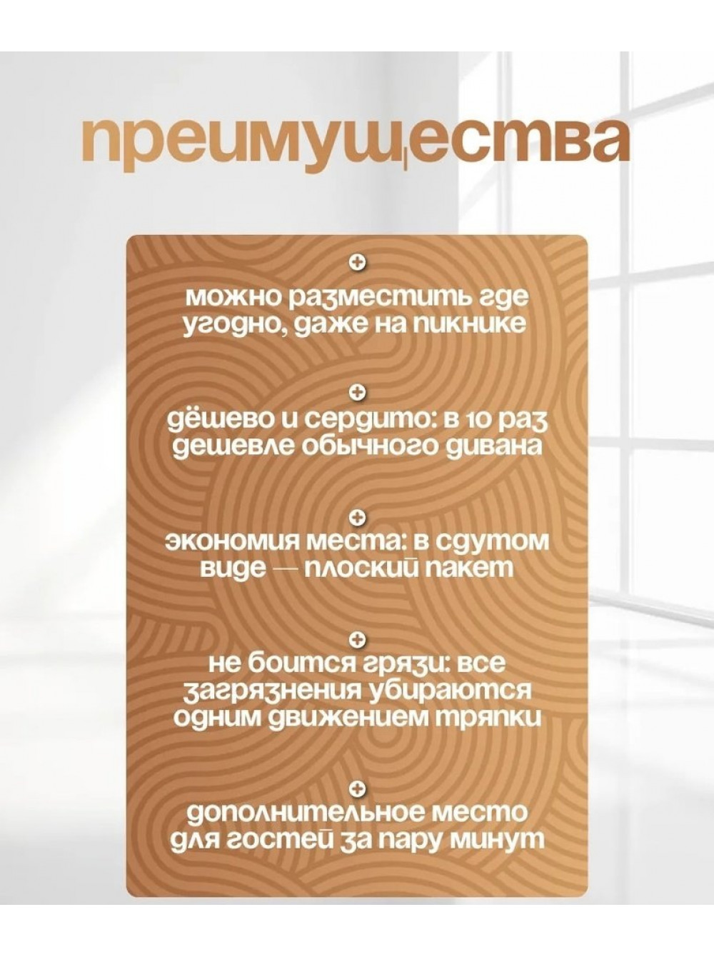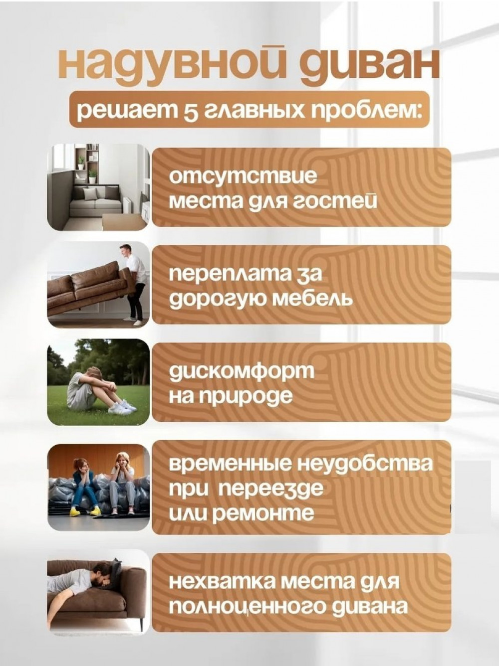 Надувной диван - это идеальное решение для отдыха на природе или дома. Его можно использовать не только в помещении но и на улице, благодоря высокопрочнуму ПВХ-материалу, который очень износостойкий. Виниловое покрытие легко чистится и не боится воды. Он имеет удобную конструкцию, легкий вес и компактные габариты в сложенном виде для переноски